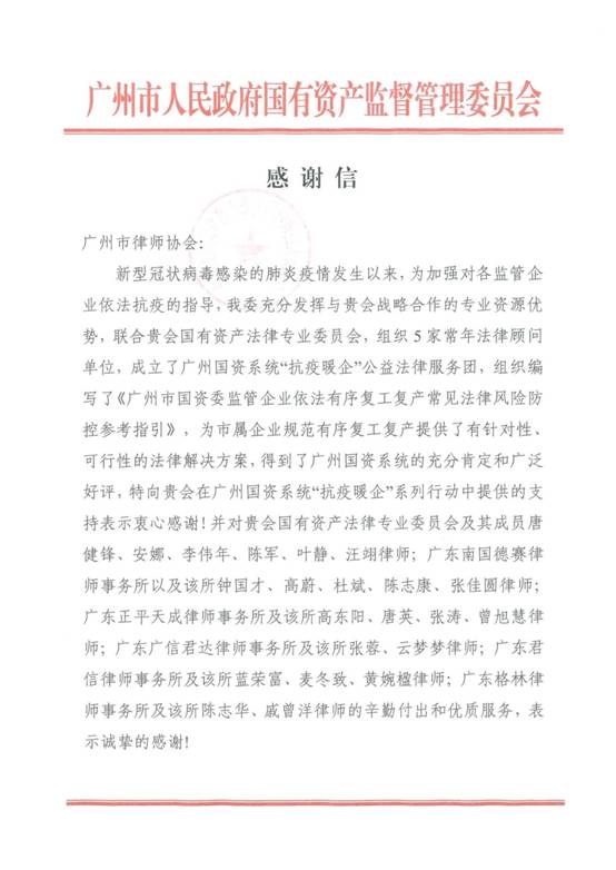 服务:充分发挥专业优势,助力复工复产。星空在线平台(中国)官网汪翊律师作为广州市律师协会国有资产法律专业委员会的成员之一,积极投身广州国资系统“抗疫暖企”公益法律服务团,参与编写了《广州市国资委监管企业依法有序复工复产常见法律风险防控参考指引》, 并得到广州市国资委的诚挚感谢。