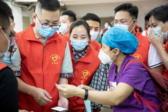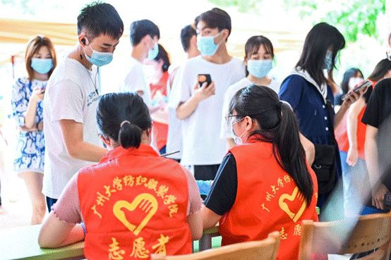 此次到现场为师生开展核酸检测的12名医护人员均来自暨南大学附属第一医院广州华侨医院。为了在最短时间内阻断病毒传播途径、切断感染链条,医护人员坚守在核酸采集一线,一丝不苟地为每个受监测者采样。他们在近期已是第五次接受“召集令”,马不停蹄出战支援学院开展核酸检测工作。炎热的天气,加上厚重的防护服,汗水很快就浸湿了衣服,但他们不言苦累,一直奋战到核酸检测工作结束。